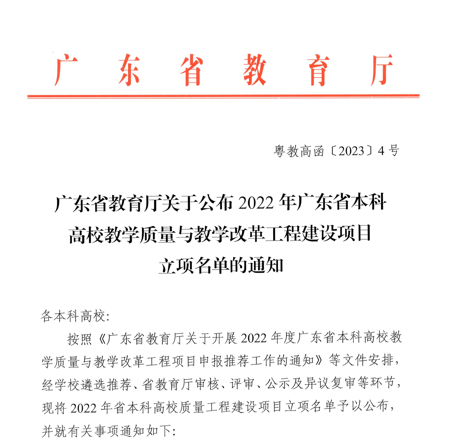 近日,广东省教育厅公布了2022年广东省本科高校教学质量与教学改革工程建设项目立项名单(粤教高函〔2023〕4号),智能制造与电气工程学院申报的2个项目均获立项,成绩喜人。