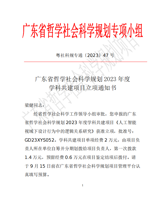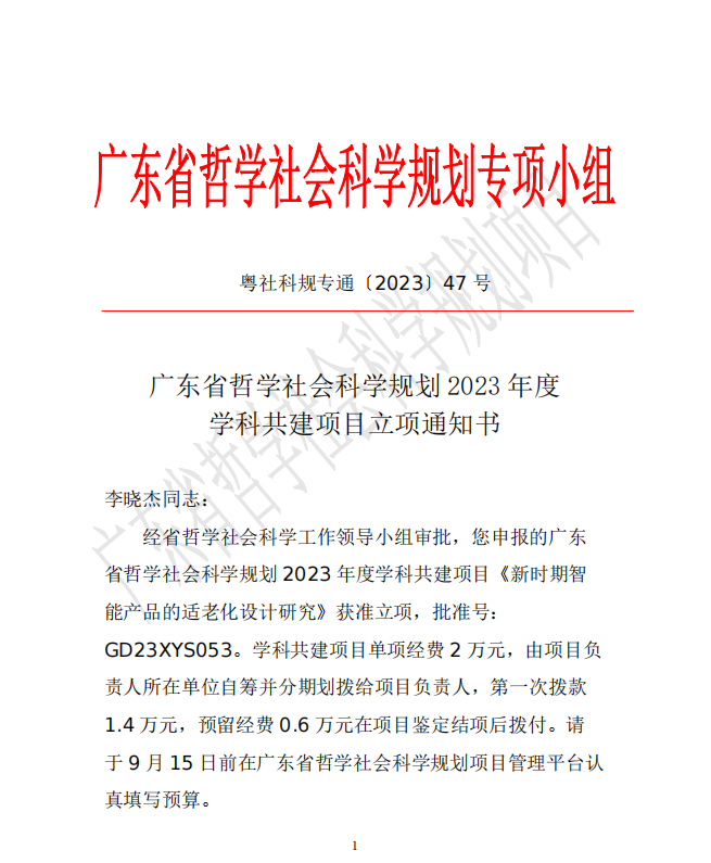 经广东省哲学社会科学工作领导小组批准(广东省社科规划办,http://www.gdpplgopss.org.cn/tzgg/content/post_1127279.html ),广东省哲学社会科学规划2023年度学科共建项目立项名单于2023年9月5日发布,全省共立项811项,其中由我院梁健老师和李晓杰老师分别申报主持的两项艺术类项目位列其中(全校共获得3项),主题分别是《人工智能视域下设计行为中的逻辑关系研究》和《新时期智能产品的适老化设计研究》。