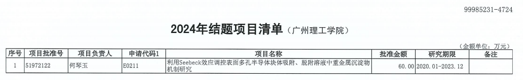 (李嘉嘉 詹夏然)日前,我校接到国家自然科学基金委员会通知,我校何琴玉教授主持的国家自然科学基金项目《利用Seebeck效应调控表面多孔半导体块体吸附、脱附溶液中重金属沉淀物机制研究》(批准号51972122)通过国家自然科学基金委员会验收,顺利如期结项。这是我校首个国家自然科学基金结题项目,是我校科研工作的又一项重要突破。