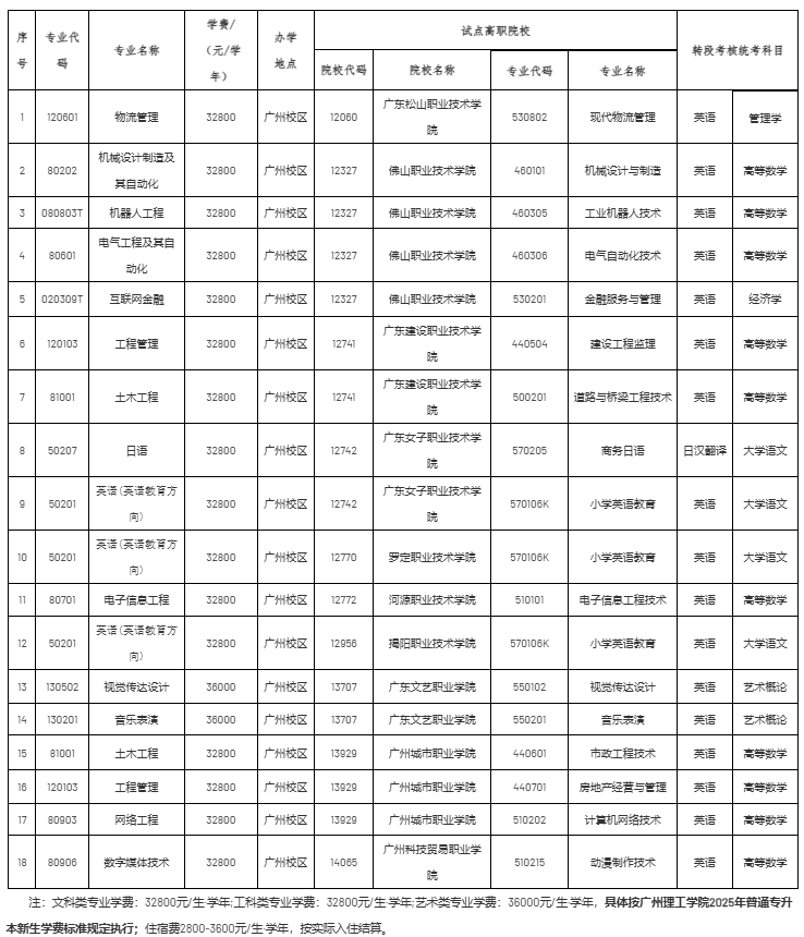 5.统一考试科目各科满分为100分,两科总分为200分。每科考试时间为120分钟。统一考试科目的考试要求由省教育考试院根据教育部专科升本科同一层次的要求编写确定,详见《广东省2025年普通高等学校专升本招生专业目录及考试要求》。