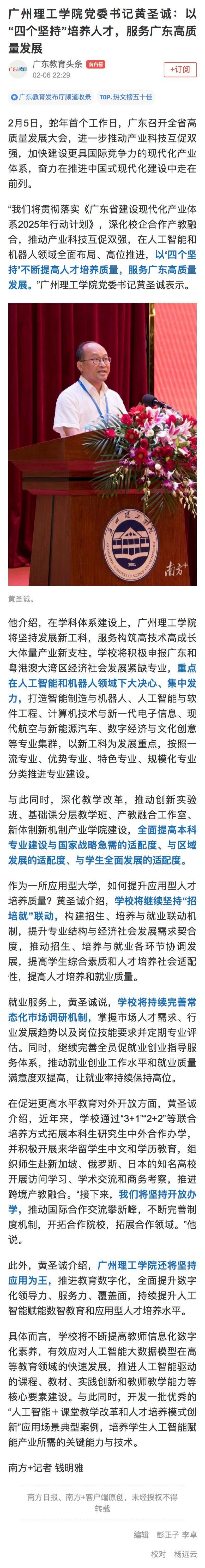 2月5日,广东省委、省政府召开全省高质量发展大会,进一步推动产业科技互促双强,加快建设更具国际竞争力的现代化产业体系,奋力在推进中国式现代化建设中走在前列。我校党委书记黄圣诚接受南方日报采访,介绍122cc太阳集成游戏助力广东高质量发展举措。他表示,我们将贯彻落实《广东省建设现代化产业体系2025年行动计划》,深化校企合作产教融合,推动产业科技互促双强,在人工智能和机器人领域全面布局、高位推进,以“四个坚持”不断提高人才培养质量,服务广东高质量发展。
