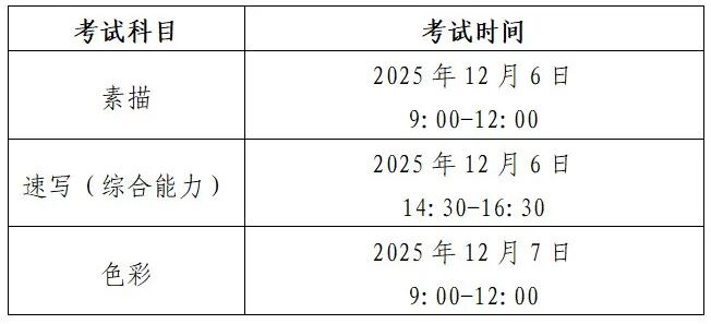 广东省2026年普通高校招生美术与设计类专业省统考将于2025年12月6日至12月7日进行,相关科目考试时间如下: