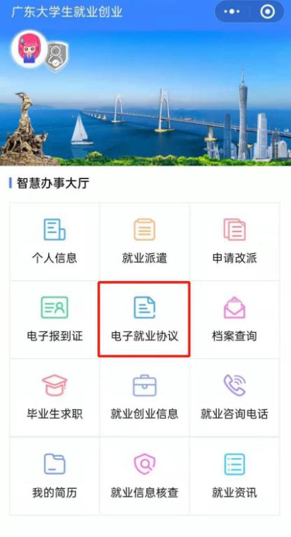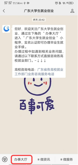 关注“广东大学生就业创业”,点击左下角“办事大厅”。