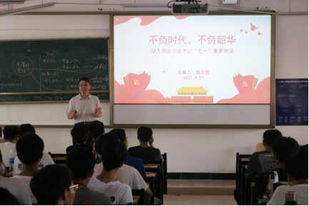 周卫星院长的授课主题是《不负时代,不负韶华》,他带领同学们深入学习领会“七一”重要讲话精神。周院长指出,新时代大学生是实现中华民族伟大复兴的先锋力量,我们“要当进步青年,不断增强做中国人的志气;要当热血青年,不断增强做中国人的骨气;要当奋斗青年,不断增强做中国人的底气”。他还勉励青年学子:“要牢记学用心志、行知诚明的校训,加强道德修养、注重道德实践,立志报效祖国、服务人民。”