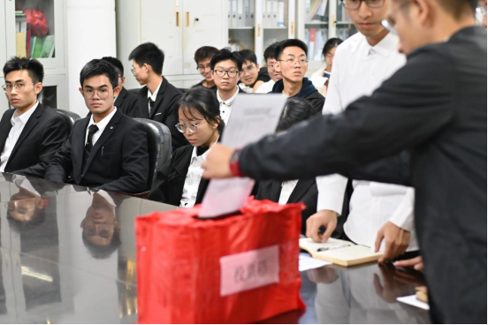 会议采取无记名投票方式进行表决,在党员同志们的一致肯定下,35位党员发展对象被接收为中共预备党员。经学生第一、第二党支部研究,形成支部大会决议。组织委员潘炜文、郭晓斌分别宣读大会决议,认为35位同志经过党组织的培养,在思想政治素质、工作学习表现等方面,已基本具备加入中国共产党员的条件,综合政审合格。党组织同意接受35位同志为中共预备党员。会议最后一项,学生第一党支部副书记吴颖聪、组织委员郭晓斌分别带领全体党员、预备党员进行入党宣誓。