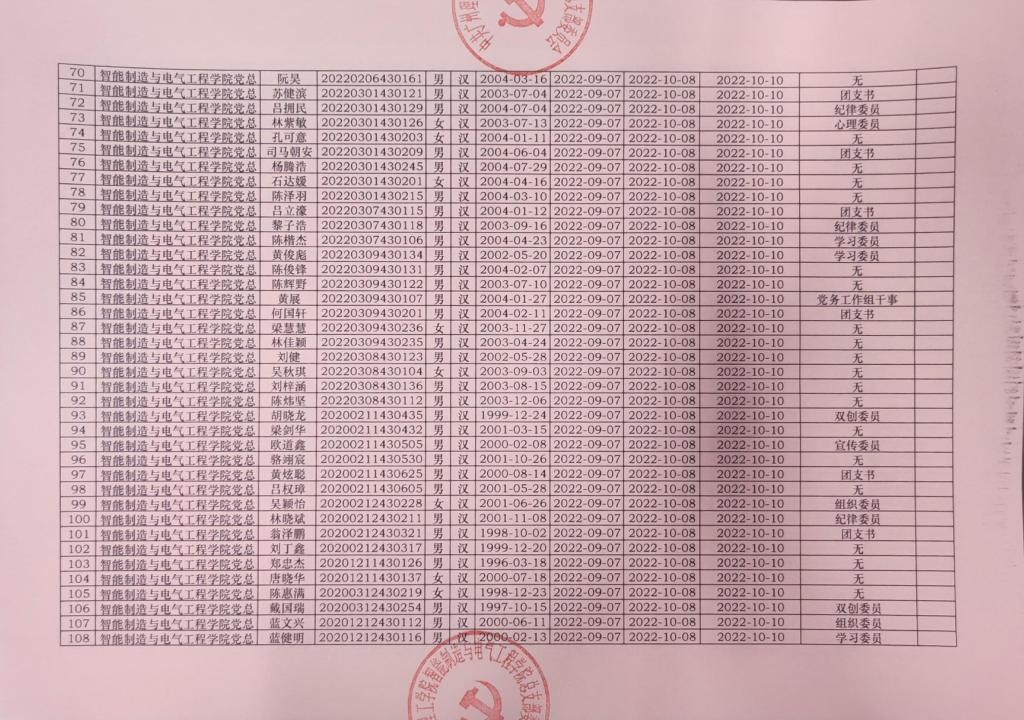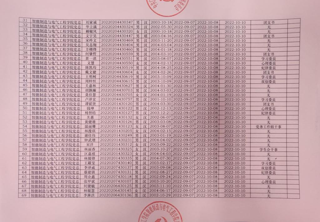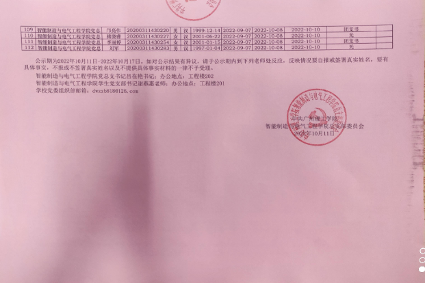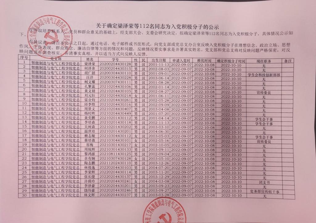 为了进一步增强发展党员工作的透明度,确保发展新党员的质量,根据《中国共产党发展党员工作细则》等文件的有关精神,在听取培养联系人、党员和群众意见的基础上,经支部大会、支委会研究决定,拟确定梁泽荣等112名同志为2022年第2期入党积极分子,现将积极分子名单公示如下,公示期7天,自2022年10月11日至2022年10月17日止。