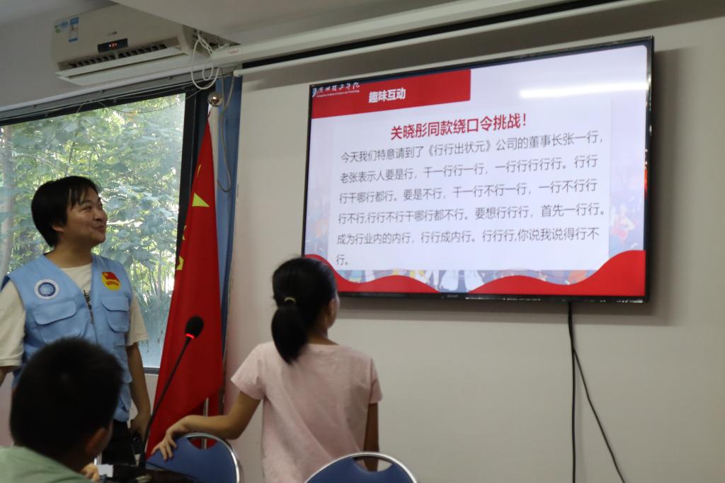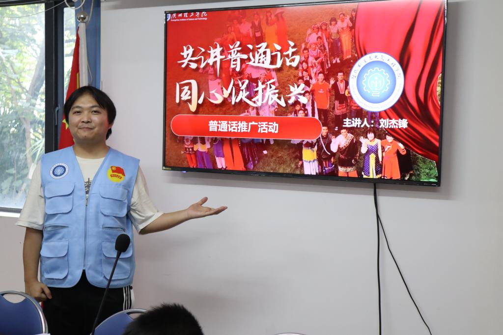 在“共讲普通话,同心促振兴”的课堂上,来自22电气5班的刘杰锋同学先给小朋友讲有趣的方言误会故事,知道了大家说一样的话有多重要。还讲了普通话的小知识,比如它是1955年才有了名字,要学北京的发音,用北方话的词,照着书上的规矩来说。大家还知道了写字要写规范字,就是那些整理过、变简单了的字。刘杰锋同学从好多方面讲了为啥要推广普通话,像能让大家更团结、方便做生意、帮我们学本领,还能让手机更懂我们说的话。然后大家一起练习,纠正“打烊”“龟裂”这些容易读错的词。最开心的是绕口令PK,“干一行行一行”“杜拉拉与拉布拉多”让大家练得又认真又兴奋;创意广告词环节,“课本是知识小飞船”“铅笔能画彩虹桥”这样的想法配上越来越流利的普通话,让课堂满是笑声。孩子们眼里闪着学会新东西的快乐,觉得说普通话原来是这么有意思的事,心里甜甜的。
