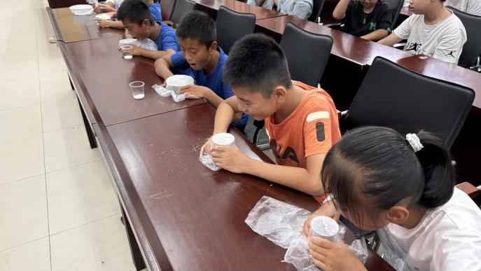 上午,实践队准备了科学探索主题课堂聚焦声音原理与节气知识。队员邱安志主讲的《声音的传递》课程设计为实验探究模式。其巧妙设置了多项简易实验:桌面振动感知、盐粒于保鲜膜表面跳动现象观察、水波模拟声波理解等。学生通过亲手触碰振动音叉、细致观察盐粒跳动并主动分享现象,课堂互动积极。针对“盐粒跳动成因”等普遍疑问,邱安志同学引导孩子们思考原理,使声音传播知识在实践操作与互动研讨中得以深化理解。