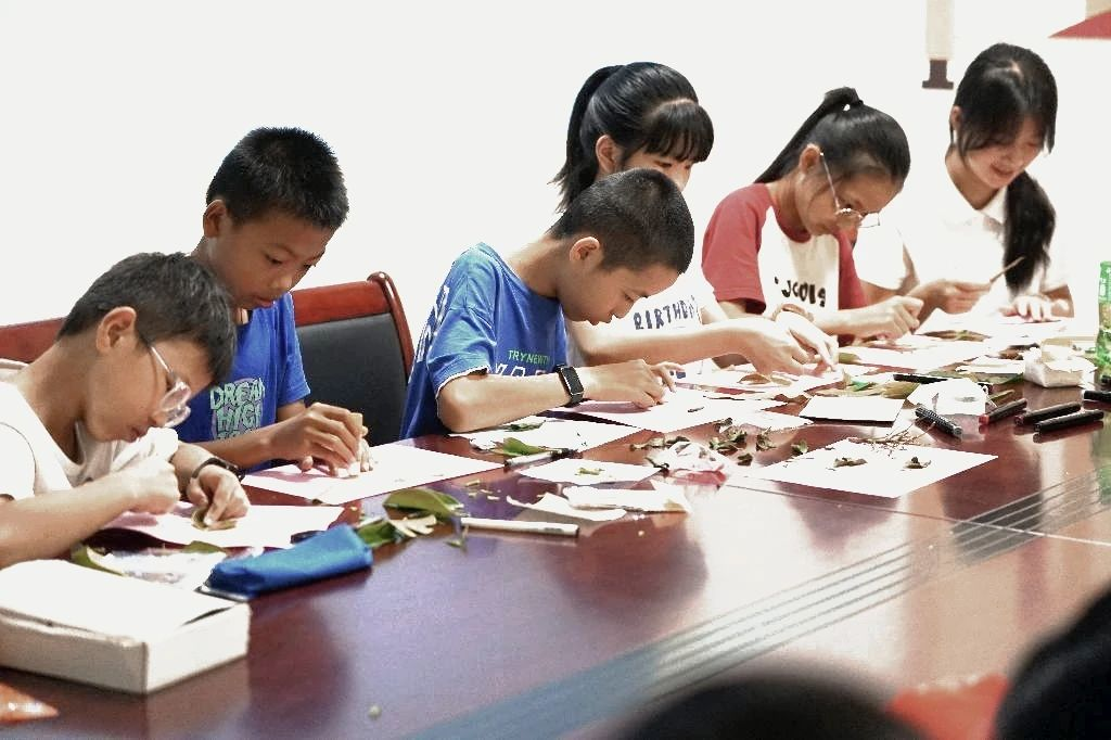 支教第三天,茶香浸润文化调研,支教课堂创意满溢。孩子们以叶为画、以布拼名,在实践中求知成长,实践队也收获满程温暖与感动 。
