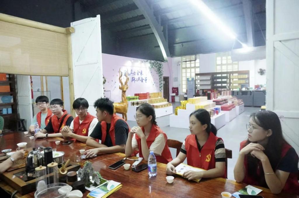 清晨,“锦带花”突击队分成两路,两名队员留在田江村村委给孩子们上课,其余七名队员前往上茗轩和英九庄园开展茶文化调研。在上茗轩的负责人详细讲解了茶文化的历史与传承,特别强调了青年一代在茶文化传播中的重要作用。队员们一边品鉴清香的红茶,一边聆听茶道精髓,还参观了珍贵的制茶老机器,感受传统工艺的魅力。