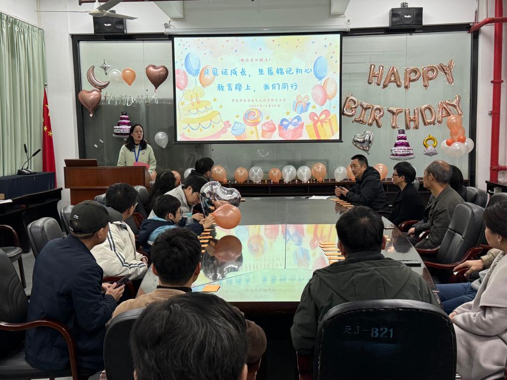 12 月 30 日晚,智能制造与电气工程学院洋溢着喜庆与欢乐的氛围,学院为2024年第四季度过生日的50位“寿星”老师们精心筹备的集体生日会在工程楼211室温馨举行。