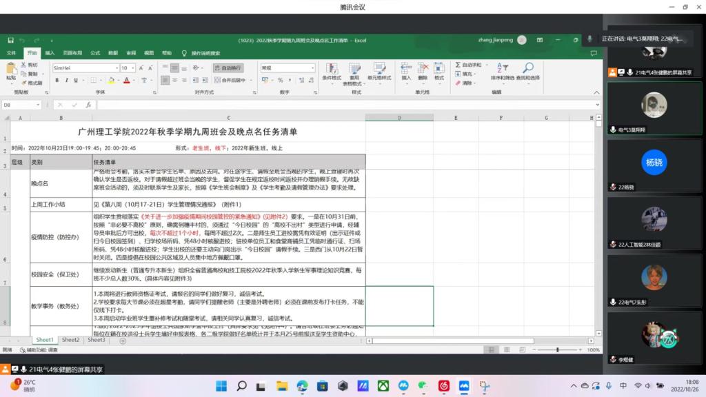10月23日晚,为进一步落实落细学校疫情防控的各项工作要求,切实加强校园疫情防控和安全管理,确保学生平稳有序地进行日常学习和生活,普及校园安全知识,增强同学们的安全防范意识和避险能力,我院召开疫情防控与安全教育主题班会,会议由各班班长主持。