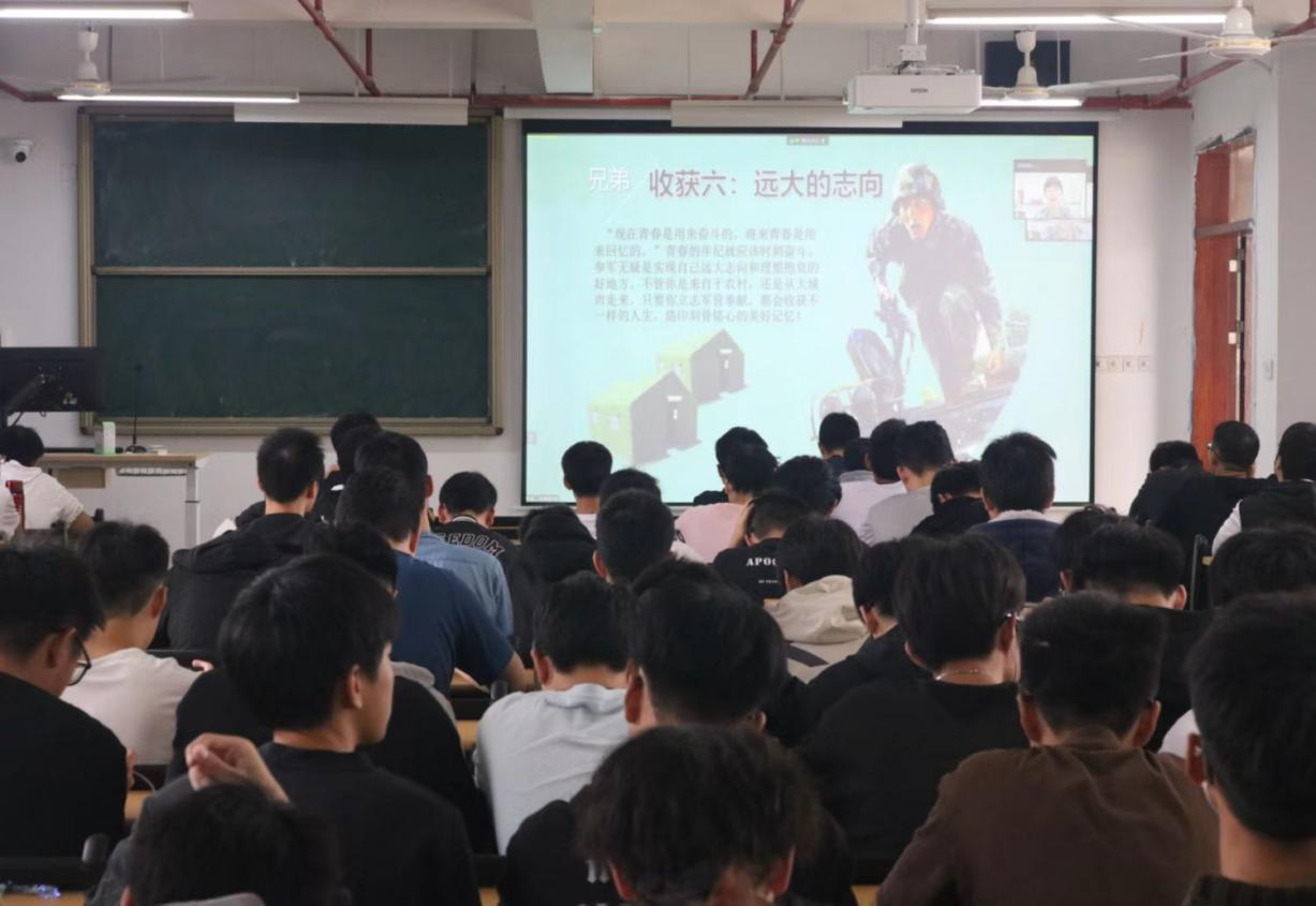 会上,三位同学通过征兵概况、入伍流程、退役优抚等方面进行宣讲。重点对毕业生应征入伍的优惠政策进行深入解读,帮助同学们认识到参军入伍是实现高质量就业的重要途径,也是人生重要的转折点。随后,三位同学展示了他们在部队的日常训练和丰富多彩的活动照片及短视频,向大家展示军营生活丰富多彩的一面,使同学们对参军入伍有更全面、更细致的了解。