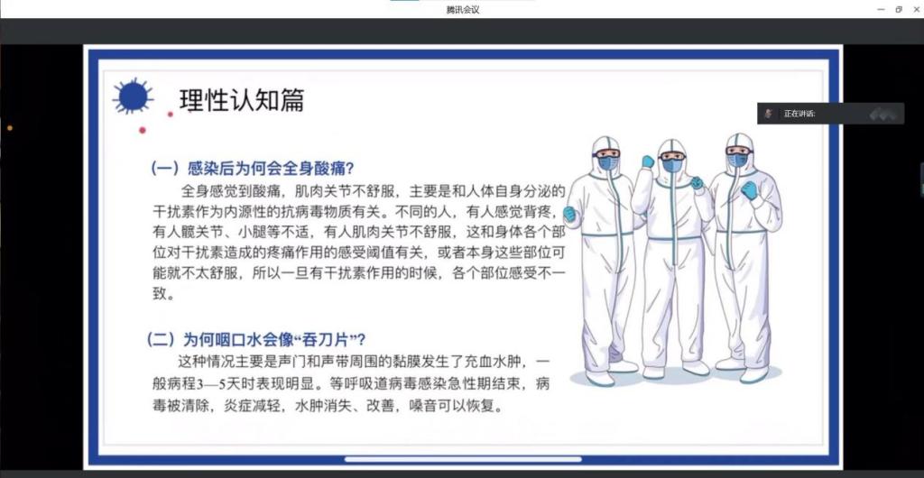 辅导员老师带领同学们学习了新冠病毒感染相关症状、新冠病毒感染者康复后注意事项等内容,并提醒同学们增强防控意识,筑牢安全屏障。随后辅导员老师从心理健康的角度,引导同学们在疫情期间要保持乐观态度,积极攻坚克难。同时,辅导员老师详细介绍了学院线上线下多种心理咨询的途径,为同学们消除恐慌,排解压力提供诸多方法和途径。