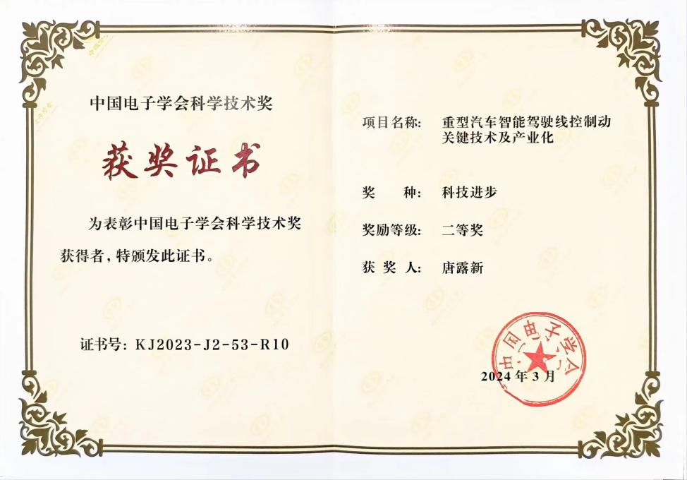 在2024.4.26-28日浙江宁波举行的第17届中国电子信息年会上,唐露新教授参与的《重型汽车智能驾驶线控制动关键技术及产业化》项目从众多参评项目中脱颖而出,荣获2023年度中国电子学会科技进步奖二等奖,也是广东省电子学会本次提名的科技进步奖最高奖项。中国电子学会作为电子学领域的专业组织,其在中国的电子学科领域享有很高地位和影响力,本次科技进步奖共有一等奖18项、二等奖共46项、三等奖40项,竞争非常激烈。中国电子学会科学技术奖,作为国家奖励办批准的社会力量设奖,在激发科技人员创新活力、促进我国电子信息科学技术和产业发展等方面发挥着积极作用。