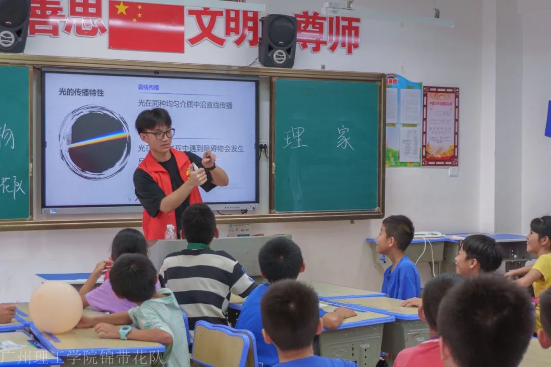 实践队依次开展了趣味课堂、心理压力调节课、什么是光与光散射、神奇的大气压强、光的折射与反射、影视鉴赏等课程,通过众多的有趣物理小实验,不仅让小朋友们直观地感受到了日常生活中物理现象的存在,还激发了他们对物理知识的浓厚兴趣。