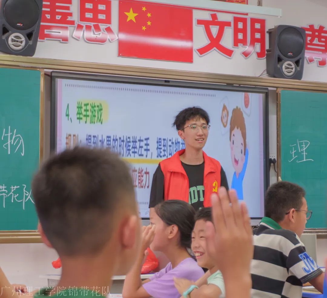上课初始,队员们都进行简短的自我介绍后,每位同学陆续上台自我介绍,“英红小小物理家”的物理课程也正式拉开帷幕。课堂上,实践队的队员们先以趣味课堂拉近与小朋友们的距离,通过与小朋友们一起参与有趣的小游戏、发放小礼物,激发了他们对课堂的兴趣,为后续的课堂教学的开展、课堂教学方式的调整提供了很大的帮助。