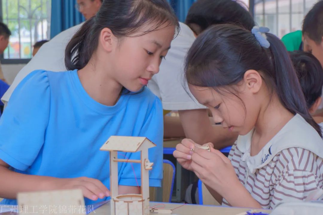 在上午的课堂中,队员李宇浩同学给小朋友们上了有趣的辘轮井理论讲解课和手工制作课,让小朋友们探索古老科技,亲手制作辘轮井,感受物理原理的奇妙。课堂上,在让同学们动手制作辘轮井之前,李宇浩同学先讲解了辘轮井的工作原理:转动轮轴时,绳索和水桶就会随之上升,从而将井水提取上来。随后他耐心地向同学们展示动手实践操作的过程。小朋友们认真按李同学的教学步骤实践着,将课堂中的理论知识学以致用。辘轮井,不仅是取水工具,更是物理智慧的结晶。小朋友们在动手中体会到了物理的魅力,感受物理带来的无限乐趣。在辘轮井课程结束后,队员周冠宇带领学生做眼保健操。上午还有队员周冠宇的凹凸面镜与凹凸透镜课程,队员黄烨的英语1:Colours课程。下午有队长杨权睿的望远镜介绍与原理课程。