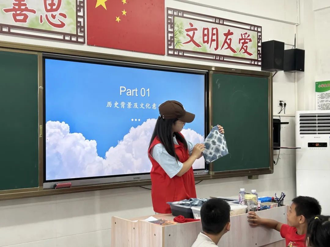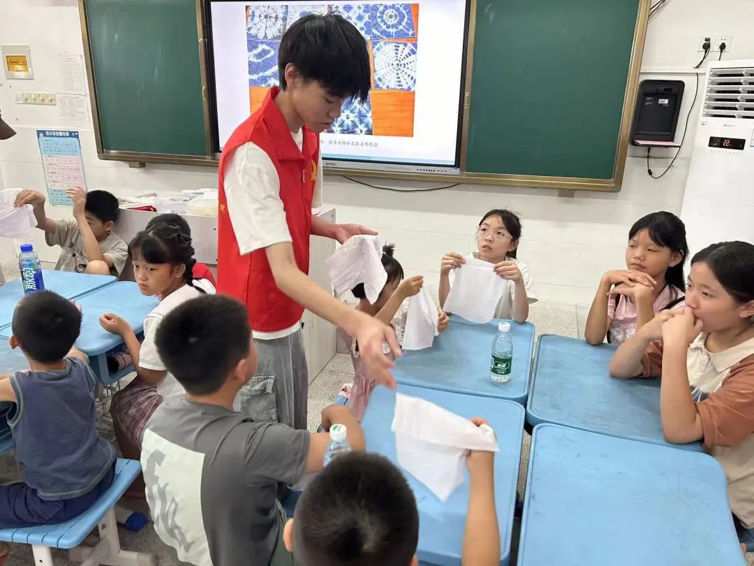 课堂伊始,创想突击队队员李诗梦以生动有趣的方式介绍了扎染的历史与魅力,并逐一介绍了简单扎染的具体流程。一种种神秘而有特色的图案,引发了小朋友们对传统文化的好奇与向往。在队员们的耐心指导下,孩子们纷纷动手尝试,他们或小心翼翼地将布料折叠、拧转,再细心地打上结;或大胆创新,尝试不同的扎结方法,只为创造出独一无二的作品。随着时间的推移,教室里弥漫起了淡淡的染料香,那些原本素净的布料,在孩子们的巧手雕琢下,变得色彩斑斓、图案各异。在作品展示环节,小朋友们脸上洋溢着快乐的笑容,每一次的尝试都充满了探索的乐趣,每一次成功都伴随着欢呼与掌声。