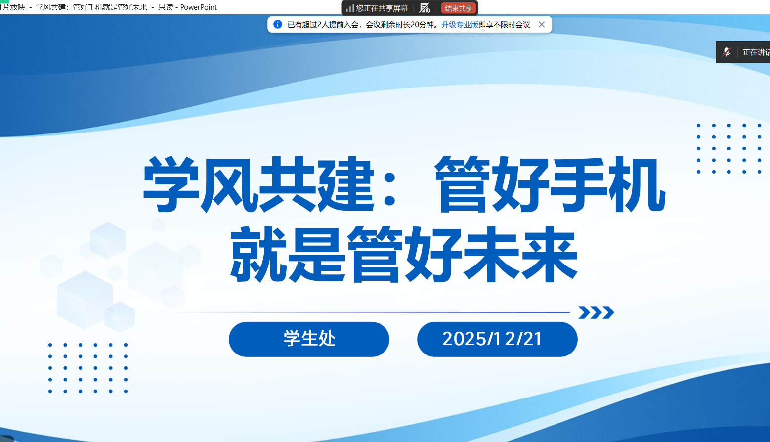 为引导学生合理使用手机,营造良好的学习氛围,12月21日晚,智能制造与电气工程学院通过线上成功召开“学风共建:管好手机就是管好未来”主题班会,各班辅导员和班长担任主讲,全体学生积极参与。