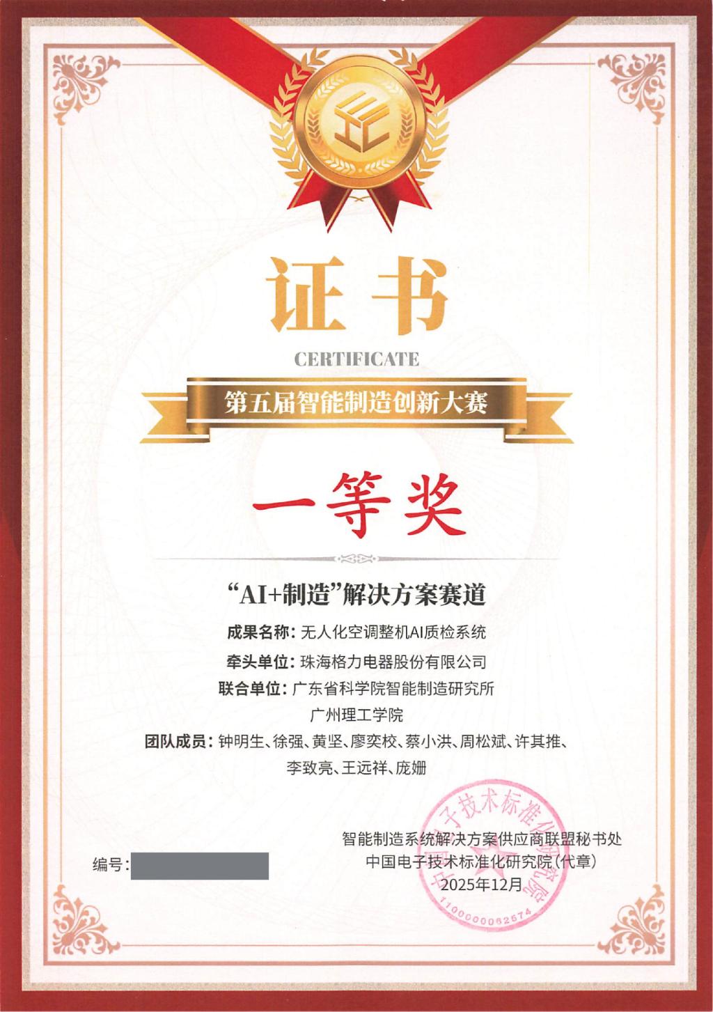我校智能制造与电气工程学院黄坚、许其推、庞姗等教师团队与珠海格力电器股份有限公司、广东省科学院智能制造研究所联合研发的“无人化空调整机AI质检系统”项目,从全国27支顶尖队伍中脱颖而出,斩获第五届智能制造创新大赛“AI+制造”解决方案赛道一等奖(唯一一项)。