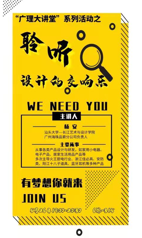 机电工程学院工业设计系5月26日晚于6-315课室举办了以“聆听设计的交响乐”为主题的讲座,本次讲座邀请到杨安老师,原汕头大学长江艺术于设计学院客座教授,广州海珠品索分公司负责人,面向工业设计、产品设计、数字媒体艺术等几个设计专业的同学进行分享。