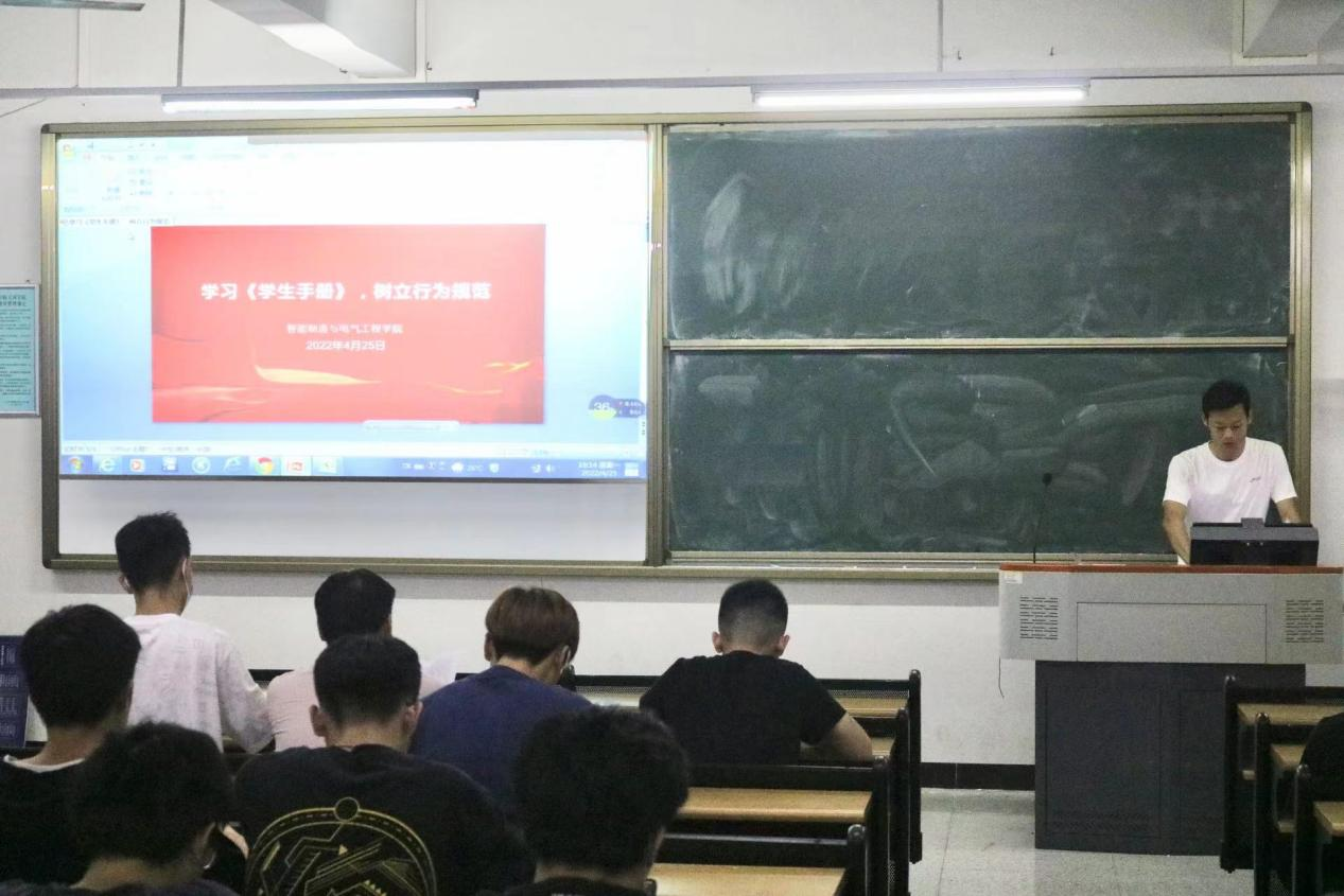 4月25日晚,为规范学生日常行为规范,督促学生重视校纪校规,弘扬爱校荣校良好风气,我院各班班委组织全体学生在6栋和12栋教学楼学习新版《学生手册》。