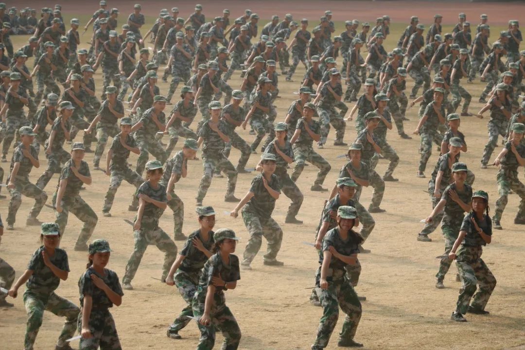 全体新生朝气蓬勃,神采奕奕,队伍踏着整齐的步伐,喊着响亮的口号走过主席台接受检阅,展示了丰硕的军训成果。同学们身姿挺拔,精神抖擞,彰显当代学子优秀的精神面貌。“军体拳准备!”一声令下,所有人迅速开始了他们的军体拳表演。踢腿、出拳,动作铿锵有力、快速利落,尽管他们练习时间不久,但他们依旧把军体拳的每一招每一式都打得有模有样,口号声此起彼伏,响彻操场。匕首方阵整齐列队,认真训练,尽显巾帼本色。刀起是飒爽,刀落是坚韧。声声“杀”字铿锵有力,无愧于“军中木兰”、“铿锵玫瑰”。军训汇演的顺利完成离不开全体大一学子在日日夜夜的训练, 烈日下的暴晒、高温和教官高标准的要求锻造了他们努力拼搏、自强不息精神。正是每天不断的摆臂挥拳练习,才能在汇演展现出英姿飒爽,生机勃勃的青春风采。