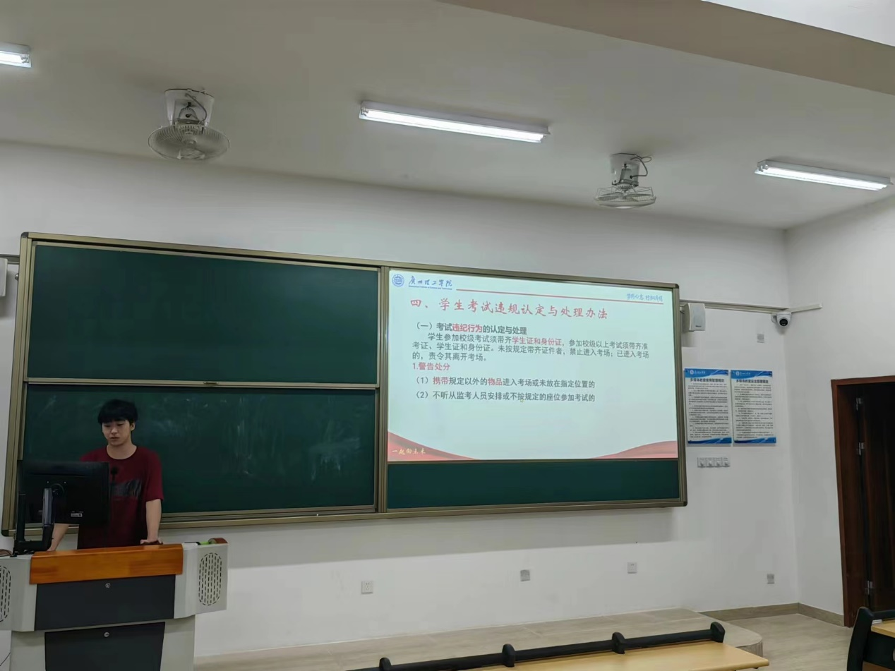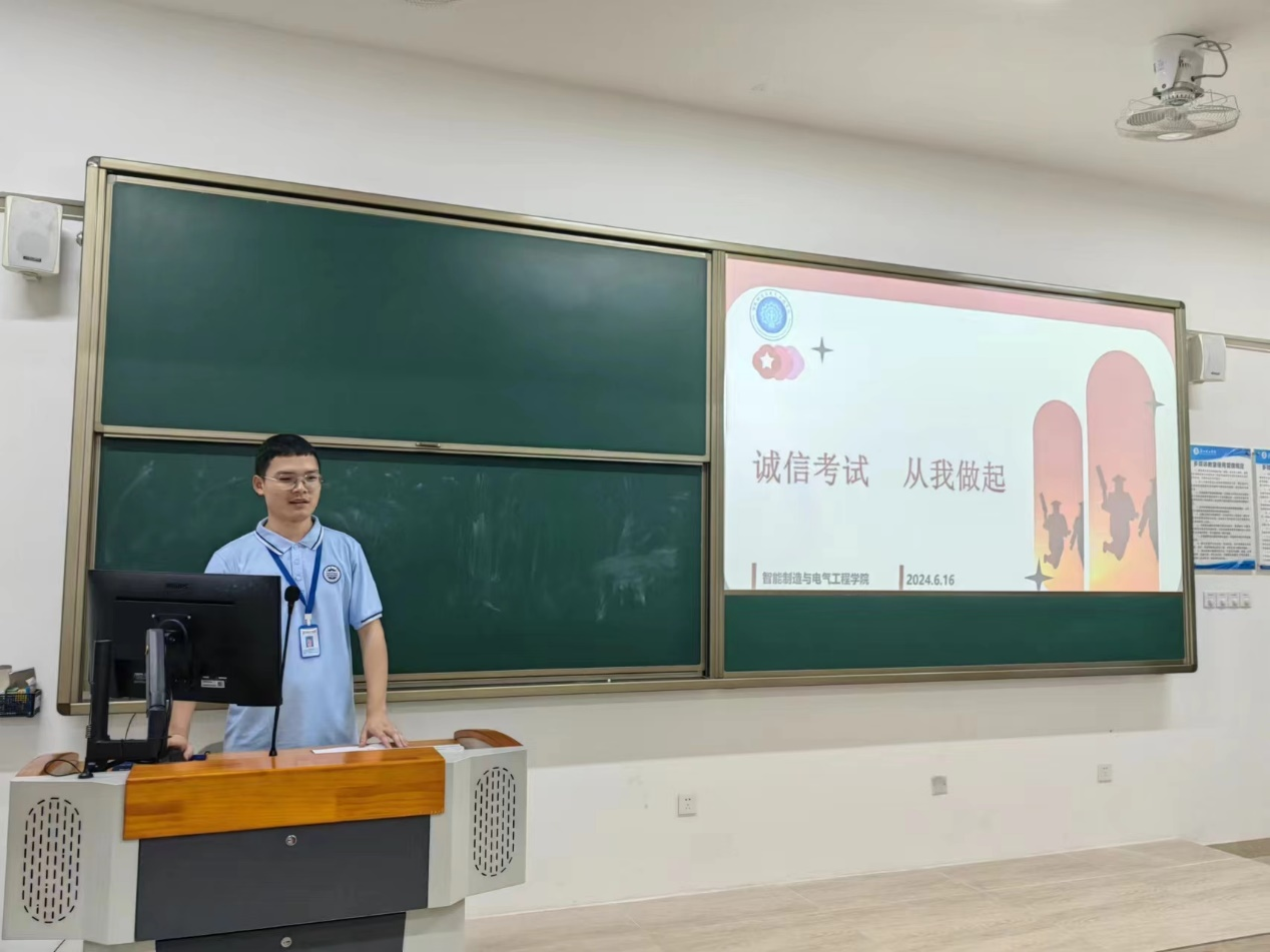 为进一步落实立德树人根本任务,加强我院诚信考试教育,营造风清气正的考试环境,6月16日晚智能制造与电气工程学院全体2023级同学在惠州校区教学楼召开“遵纪守规,诚信应考”主题班会,班会由辅导员老师主讲,组织学习诚信考试的相关知识,使同学们认识到了诚信应考的内涵与意义。