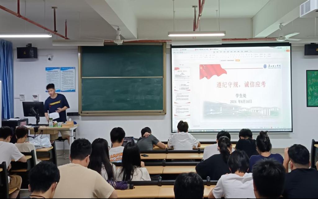 临近期末周,为了树立正确的考试观念,倡导诚信考试,6月16日晚上,我院在13栋教学楼组织各班级开展“遵纪守规,诚信应考”主题班会活动,班会由各班班长主持,各班学生积极参与。