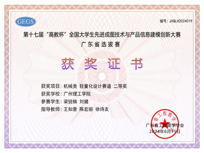 5月25日,在第十七届大学生先进成图技术与产品信息建模创新大赛机械类广东省选拔赛(线上)中,我校122cc太阳集成游戏教师王如意、陈宏丽、鄢圣杰、徐诗友、樊港奥带领20位不同专业学子参加本次大赛。经过初赛的激烈角逐,我校获得省赛团体三等奖。刘健、林毅俊、陈炜坚、袁秀燚、梁永政、林紫敏、苏健滨、杨乾熙、徐世强、吕立濠同学在先进成图技术机械赛道中分别荣获省级三等奖。此外,在5月12—13日进行的轻量化设计赛道中,刘健和梁锐楠两位同学荣获省级二等奖。