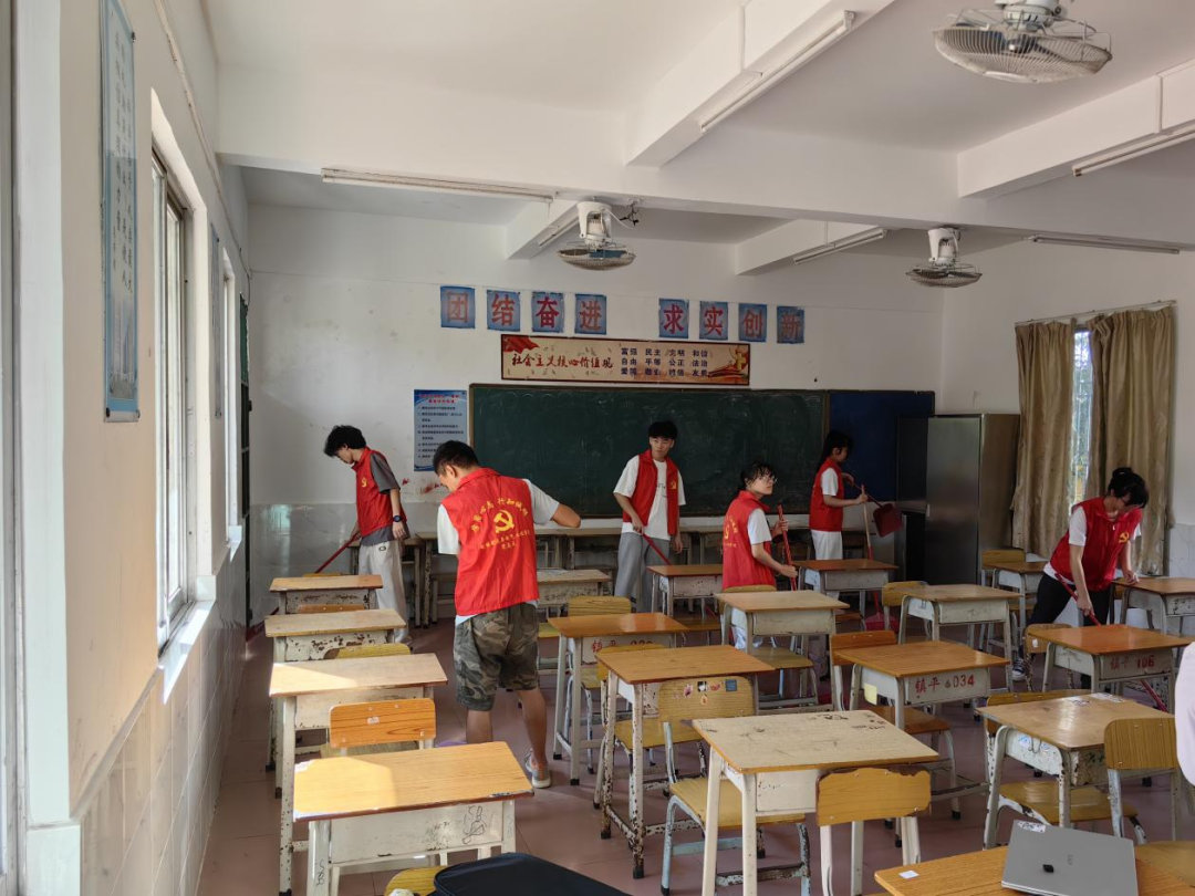 队员们在打扫教室卫生