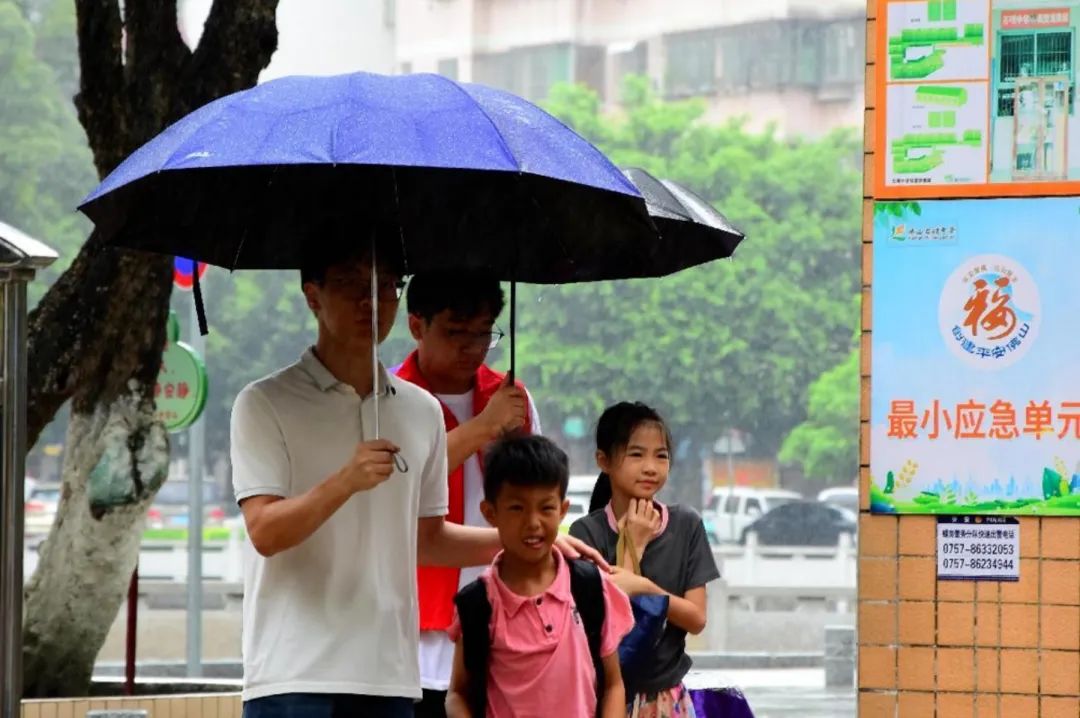 夏日多雨,石肯社区志愿者与突击队队员们在石肯中学门口为小朋友们撑伞,接待他们进入学校,保证在下雨天的安全,让家长们更安心,让小朋友们顺利参与接下来的课程。