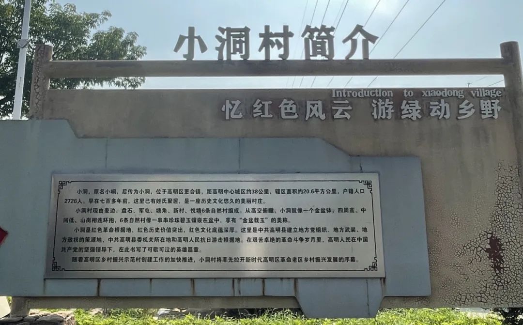 小洞村是红色革命根据地,红色历史价值突出,红色文化底蕴深厚。这里是中共高明县建立地方党组织、地方武装、地方政权的策源地,中共高明县委机关所在地和高明人民抗日游击根据地。在艰苦卓绝的革命斗争岁月里,高明人民在中国共产党的坚强领导下,在此书写了可歌可泣的英雄篇章。