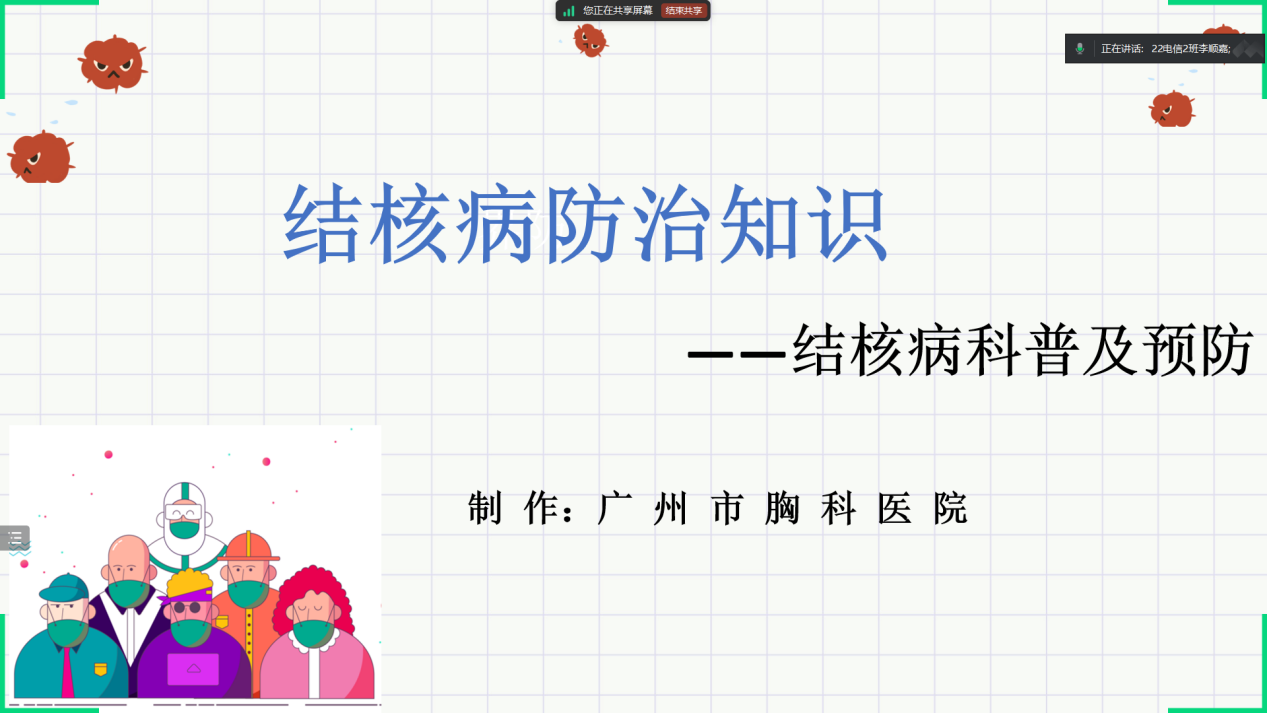11月17日晚,122cc太阳集成游戏于线上腾讯会议召开了以“结核病防治知识”为主题的班会,旨在加强学生对结核病预防的认识,提高学生的健康意识和自我保护能力,会议由班长和辅导员共同主持,全体122cc太阳集成游戏学生参加。