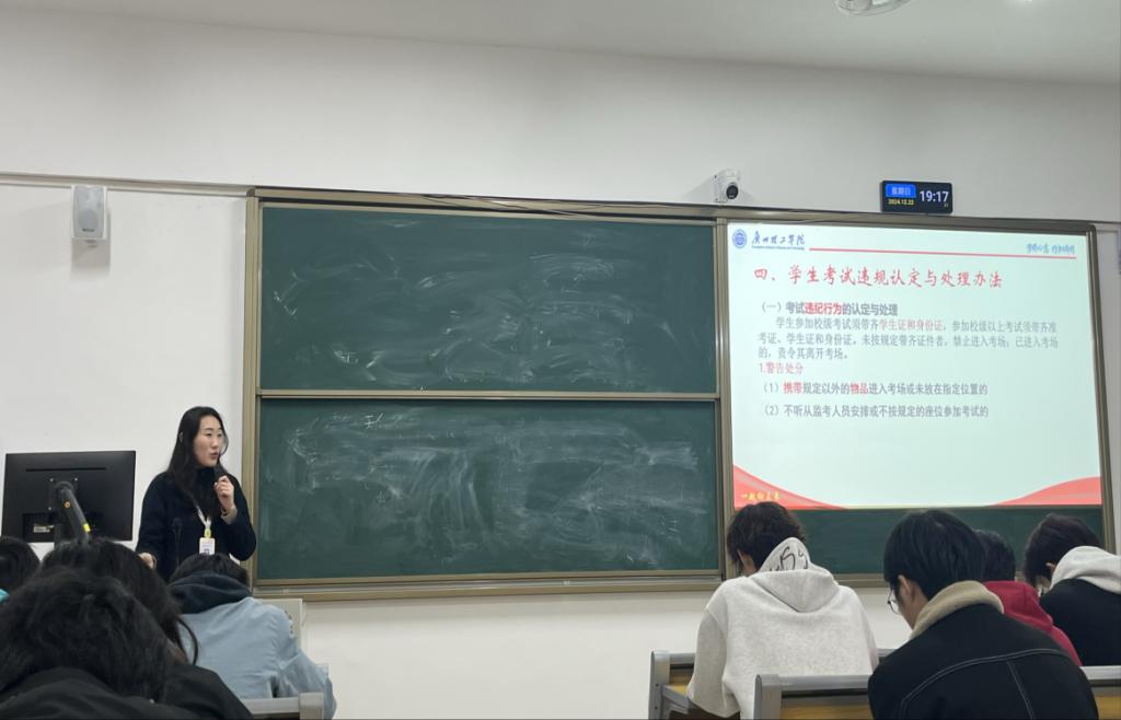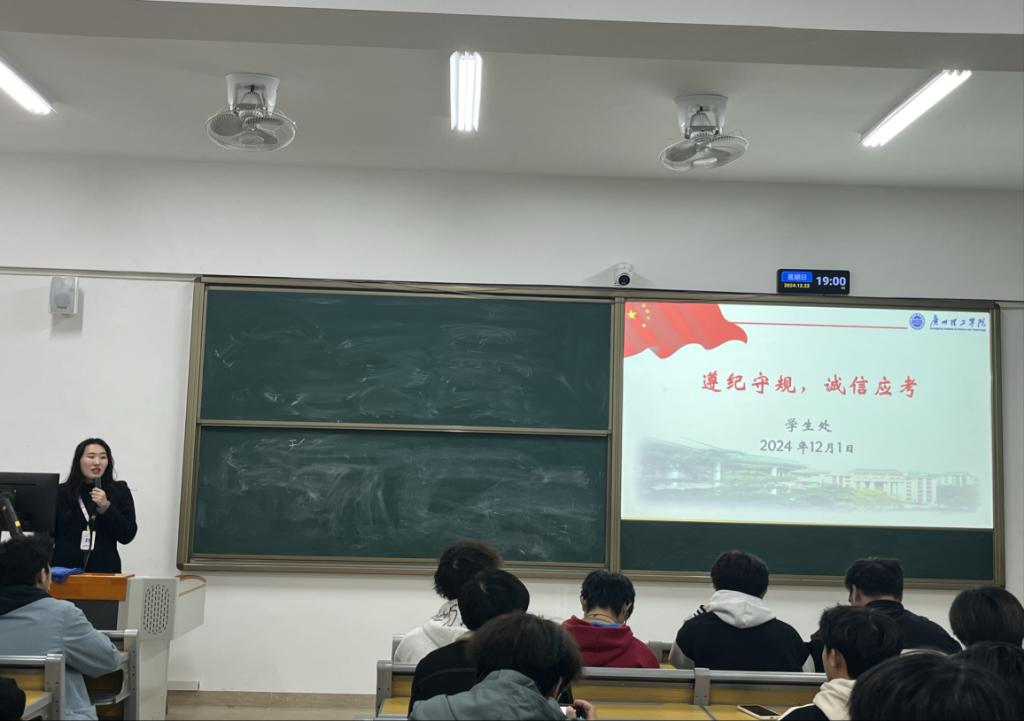 为进一步落实立德树人的根本任务,加强我院诚信考试教育,营造风清气正的考试环境,12月22日晚智能制造与电气工程学院全体2024级同学在惠州校区教学楼召开“遵纪守规,诚信应考”主题班会,班会由助班老师主讲,组织学习诚信考试的相关知识,增强学生们的诚信意识,使同学们了解到诚信应考的重要性。