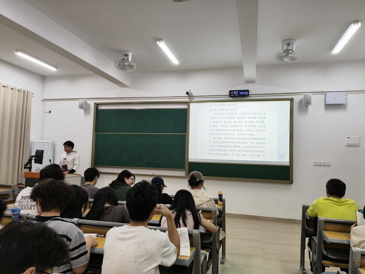 班会首先重点解读了《学生养成教育工程》实施方案,要求全体学生结合自身实际情况,认真思考并选定三个需重点培养的好习惯项目,制定个性化养成计划,通过日常点滴积累实现行为规范与素质提升。辅导员强调,习惯养成是学风建设的重要基础,鼓励同学们以行动践行“知行合一”。另外,辅导员针对学校制发的《学生养成教育公开信》,班会要求同学们将信件转发家长,推动家校共同监督、支持学生习惯养成计划。通过家庭与学校的双向互动,构建全方位育人网络,为学生成长注入持续动力。