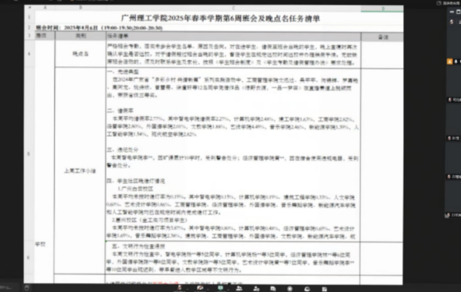 班会首先强调了考勤纪律的重要性,要求各班严格记录未参会学生名单、原因及去向。会议上,辅导员还通报了近期班级请假率、违纪处分情况,并对表现突出的先进典型予以表扬,鼓励同学们严守校规,共同营造良好学风。