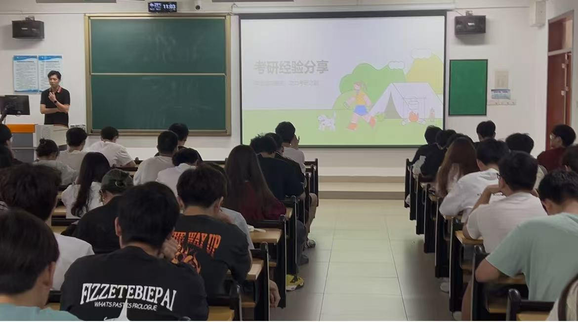 分享会上,陈志强师兄结合自身经历,从本科学习、工作经历、考研复习、院校专业选择等方面进行了详细讲解。着重强调了目标规划的重要性,他表示:“清晰的目标能让考研之路更有方向,备考过程中要学会根据自身情况调整计划。” 之后在互动环节,现场气氛热烈。同学们踊跃提问,陈志强师兄耐心解答,针对跨专业考研、复试注意事项等问题进行了深入交流。