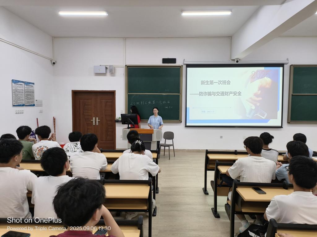 为提高2025级普高新生安全防范意识和自我保护能力,着力营造安全稳定和谐的校园环境。9月6日晚,智能制造与电气工程学院在教学楼举行2025级新生入学第一次班会,班会聚焦防诈骗与交通财产安全教育,助力新生筑牢安全意识。班会由辅导员主持,助理班主任主讲,全体新生参会。