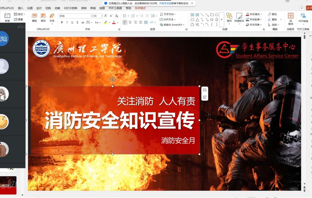 为增强学生的消防安全意识,提高应对火灾等突发情况的能力,11月9日晚,智能制造与电气工程学院全体同学在线上召开“消防安全知识宣传”主题班会。班会由辅导员和班长共同主讲,全体同学积极参与。
