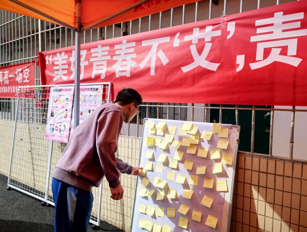 活动现场设置了多个互动区域,营造出轻松而富有教育意义的氛围。在“关爱表达区”,同学们纷纷写下对艾滋病患者的关怀寄语和防艾承诺,将一张张饱含温度与责任的留言贴满“关爱墙”,展现出青年一代对健康议题的关注与担当。