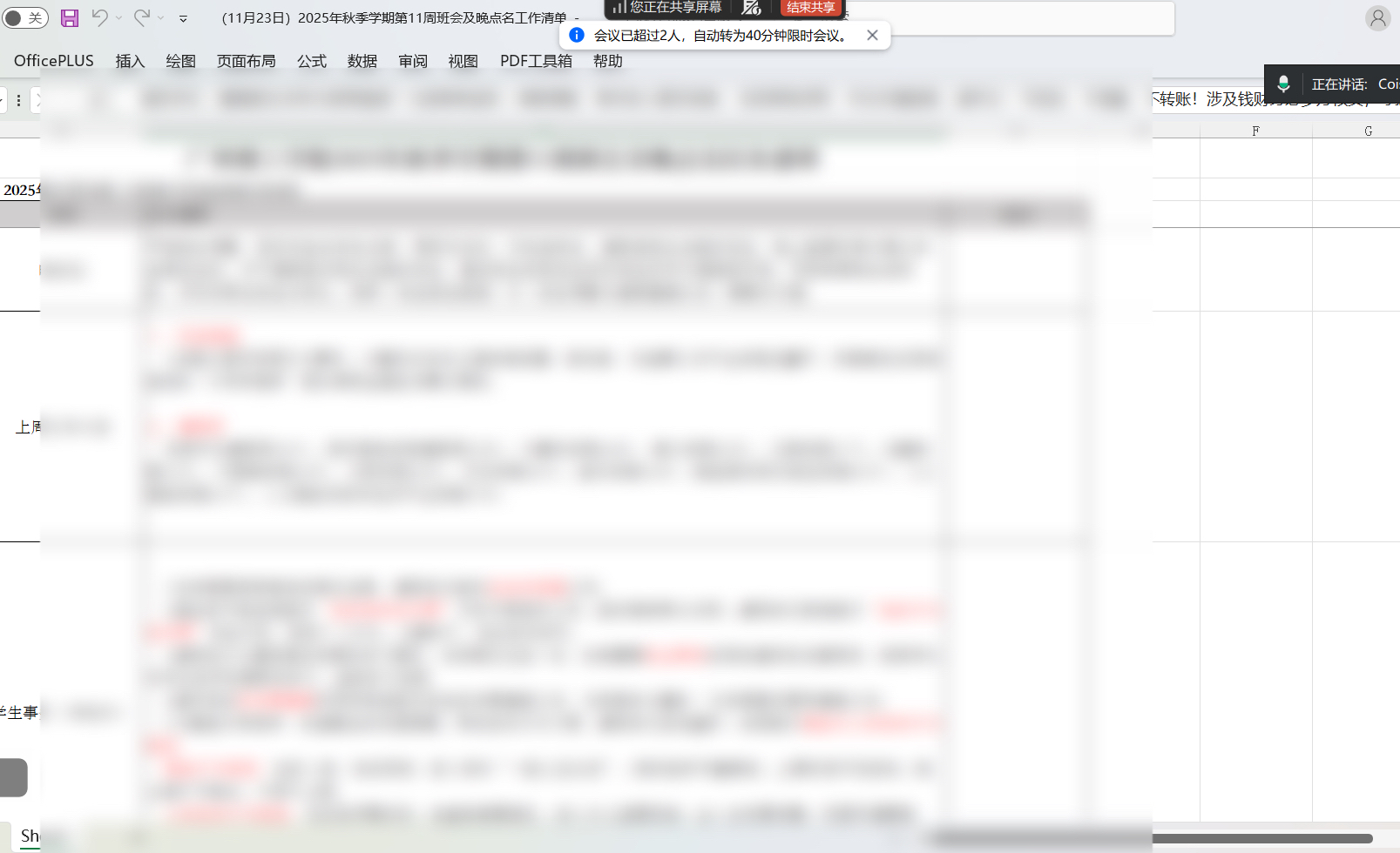11月23日晚,122cc太阳集成游戏通过线上会议形式召开第十一周班会,辅导员与各班班长主讲,全体同学准时参会。本次班会围绕考勤管理、学期总结、行为规范及安全教育等内容展开,强化学生责任意识,营造良好校园氛围。
