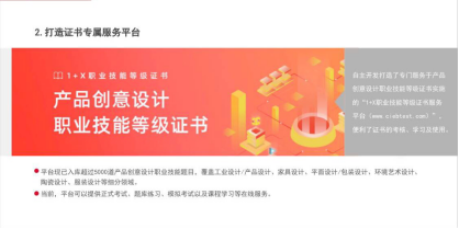 产品创意设计职业技能等级证书分为初级、中级和高级共三级,等级依次递进。它涵盖了产品设计和创意设计两大专业领域。前者主要针对产品设计、工业设计和机械设计等专业,后者主要针对艺术设计、工艺美术设计、环境设计等专业;同时适用于中等职业院校、高等职业院校、应用型本科高校等学生群体。