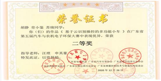 12月26日,广东省第五届汽车与农机电子环保大赛在华南农业大学举行,我校电气学院胡静、劳小鉴和苏瑞同学设计的《基于云识别的多功能小车》与李卓威、谢伟康和陈琳同学设计的《AI看护机器人》分别获得二等奖。