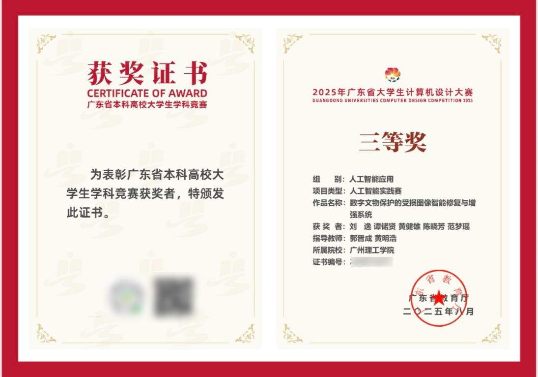 5月8日,由智能制造与电气工程学院电子信息专业的5名学生团队开发的"数字文物保护的受损图像智能修复与增强系统",在4666件参赛作品中脱颖而出,荣获了“2025年广东省大学生计算机设计大赛暨第18届中国大学生计算机设计大赛粤港澳大湾区赛”三等奖。