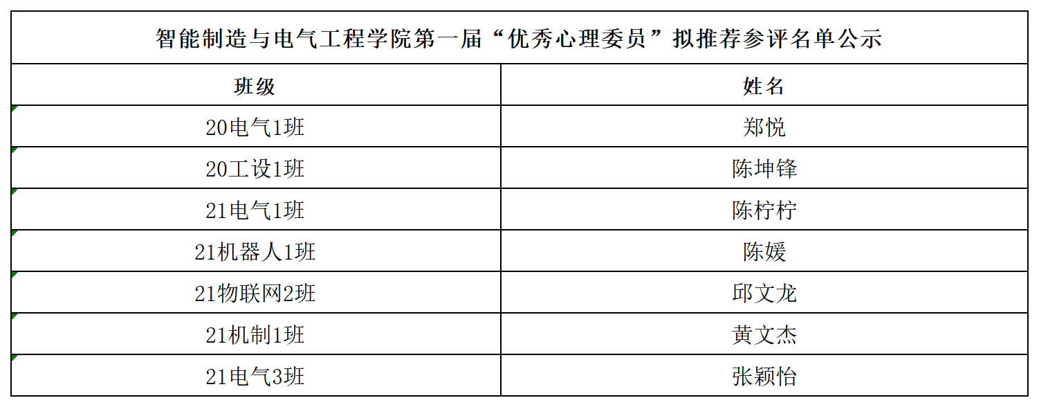 根据《关于开展第一届“优秀心理委员”评选活动的通知》文件要求,经个人申报、学院初审,学院拟推荐以下7名班级心理委员参加学校第一届“优秀心理委员”评选。以上名单于2022年3月13日至2023年3月15日进行公示,如有异议,请于2023年3月15日前向老师反映:何老师;办公地点:工程楼201。