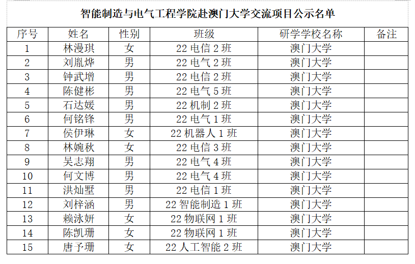 根据《122cc太阳集成游戏学生处关于选派优秀学生赴澳门大学短期研习的通知》,经前期学生自愿报名,学院审核把关,拟推荐林漫琪等15位同学赴澳门大学开展学术交流活动,拟派出学生名单如下,公示期为2023年10月20日至2023年10月24日。期间若对该名单有异议,请在公示期间内向122cc太阳集成游戏办公室反映。反映情况时请签署真实姓名和联系电话,有具体事实;不签署真实姓名或不提供具体事实材料的,将不予受理。