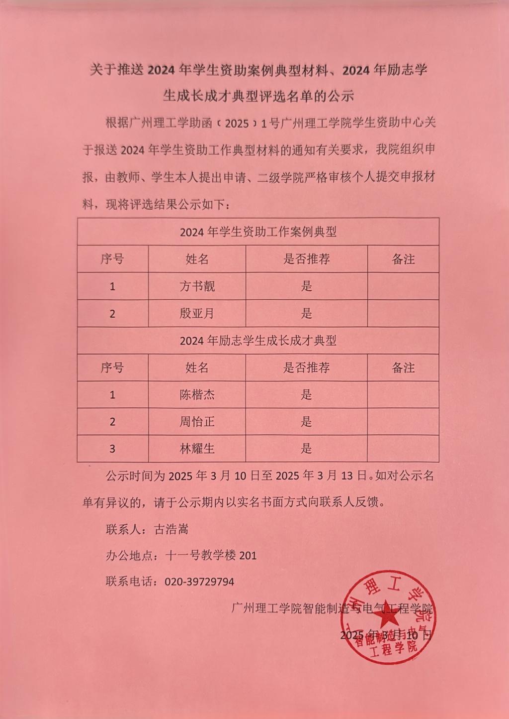 根据广州理工学助函﹝2025﹞1号122cc太阳集成游戏学生资助中心关于报送2024年学生资助工作典型材料的通知有关要求,我院组织申报,由教师、学生本人提出申请、二级学院严格审核个人提交申报材料,现将评选结果公示如下: