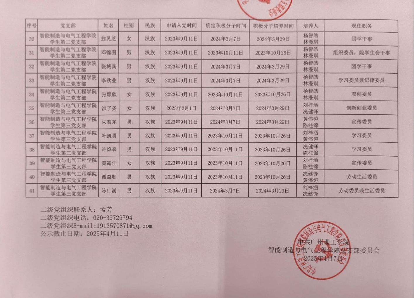 在听取培养联系人、党员和群众意见的基础上,经支部大会、支委会研究决定,拟确定王子炎等41名同志为发展对象,具体情况公示如下。